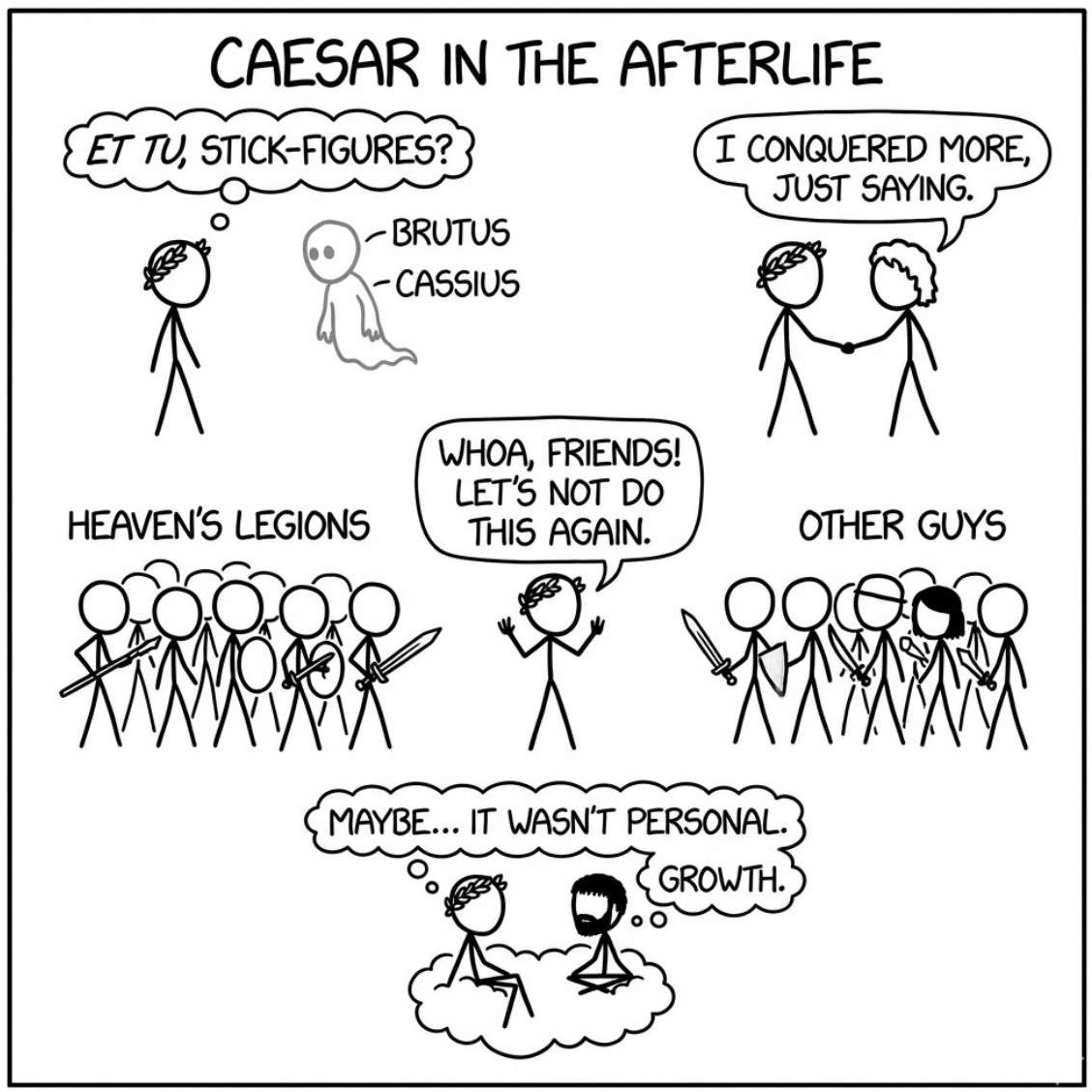 Julius Caesar navigates the afterlife, haunted by past betrayals. He encounters historical figures like Alexander the Great and grapples with conflicting emotions regarding his assassination. When a war threatens Heaven, Caesar intervenes to prevent conflict, ultimately discovering the importance of friendship, forgiveness, and personal growth.
